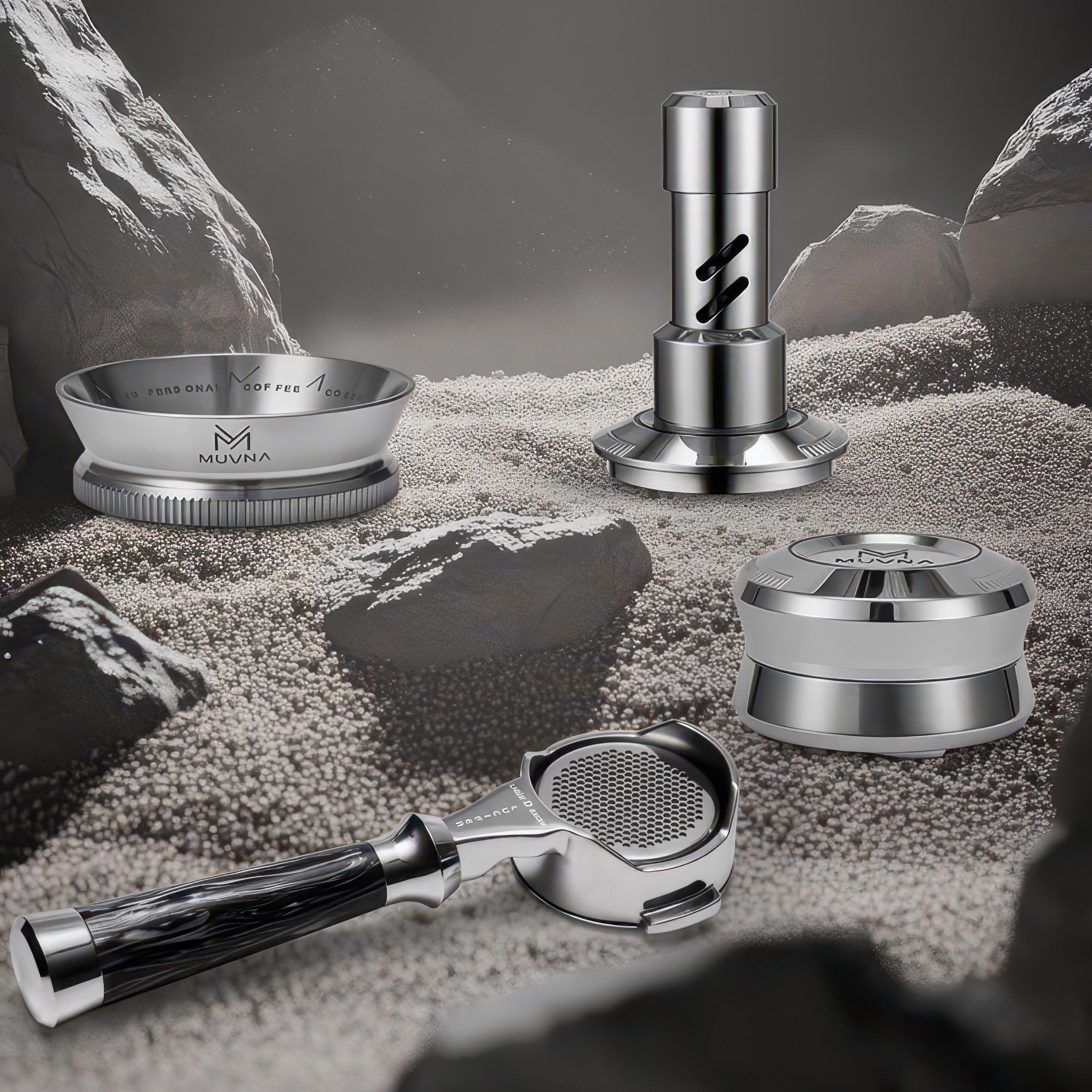 Professional Tamping Accessories: Complete five-tool set for precise espresso preparation including tamper, distributor, funnel, portafilter, and mat.