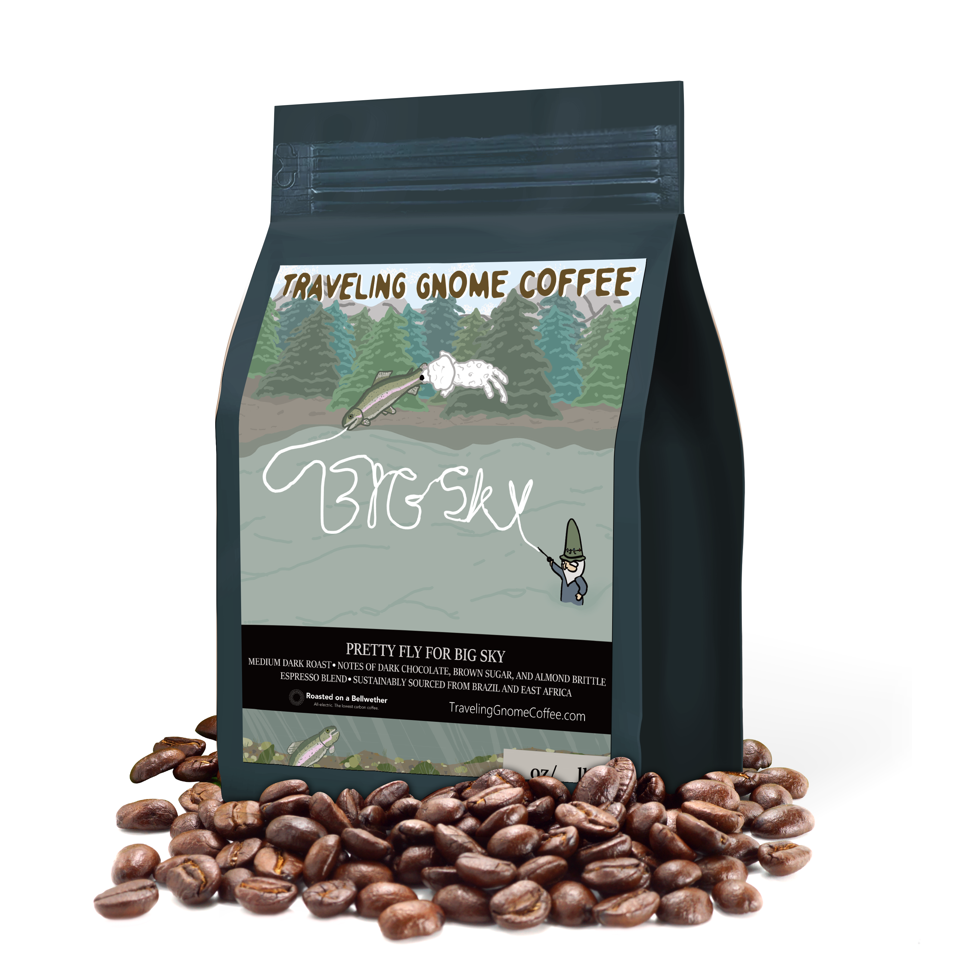 Big Sky Blend - this medium-dark roast w/notes of dark chocolate, brown sugar, and almond brittle, captures the spirit of adventure and the tranquility of nature. The Big Sky Blend is a tribute to the fly fishing culture in Montana, offering a cup that's as expansive and inviting as the state's big skies and forested mountain landscape. Whether you're starting your day or taking a moment to relax after an outdoor adventure, this coffee is a perfect companion.