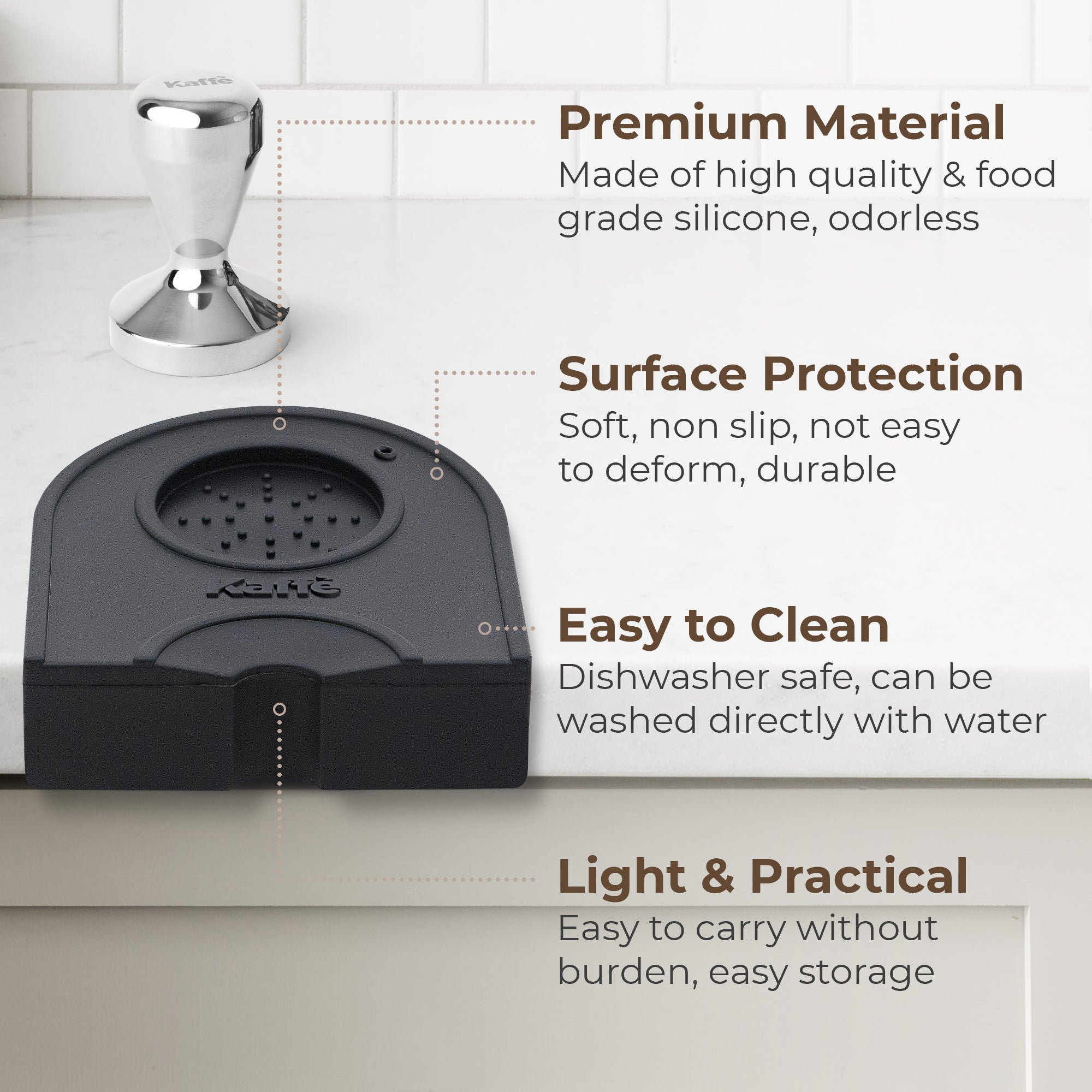 - COMPACT & STURDY: Kaffe's Tamper mat is compact and sturdy, its thick silicone material is designed for repeated use and its compact size keeps your work area is free of clutter which makes it an ideal barista accessory on any countertop.