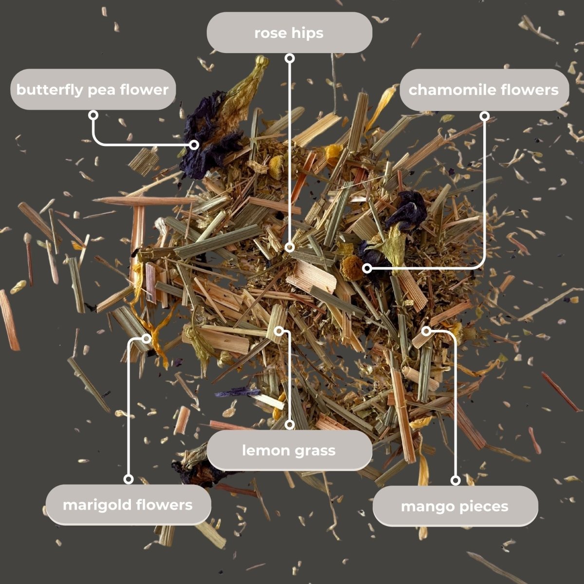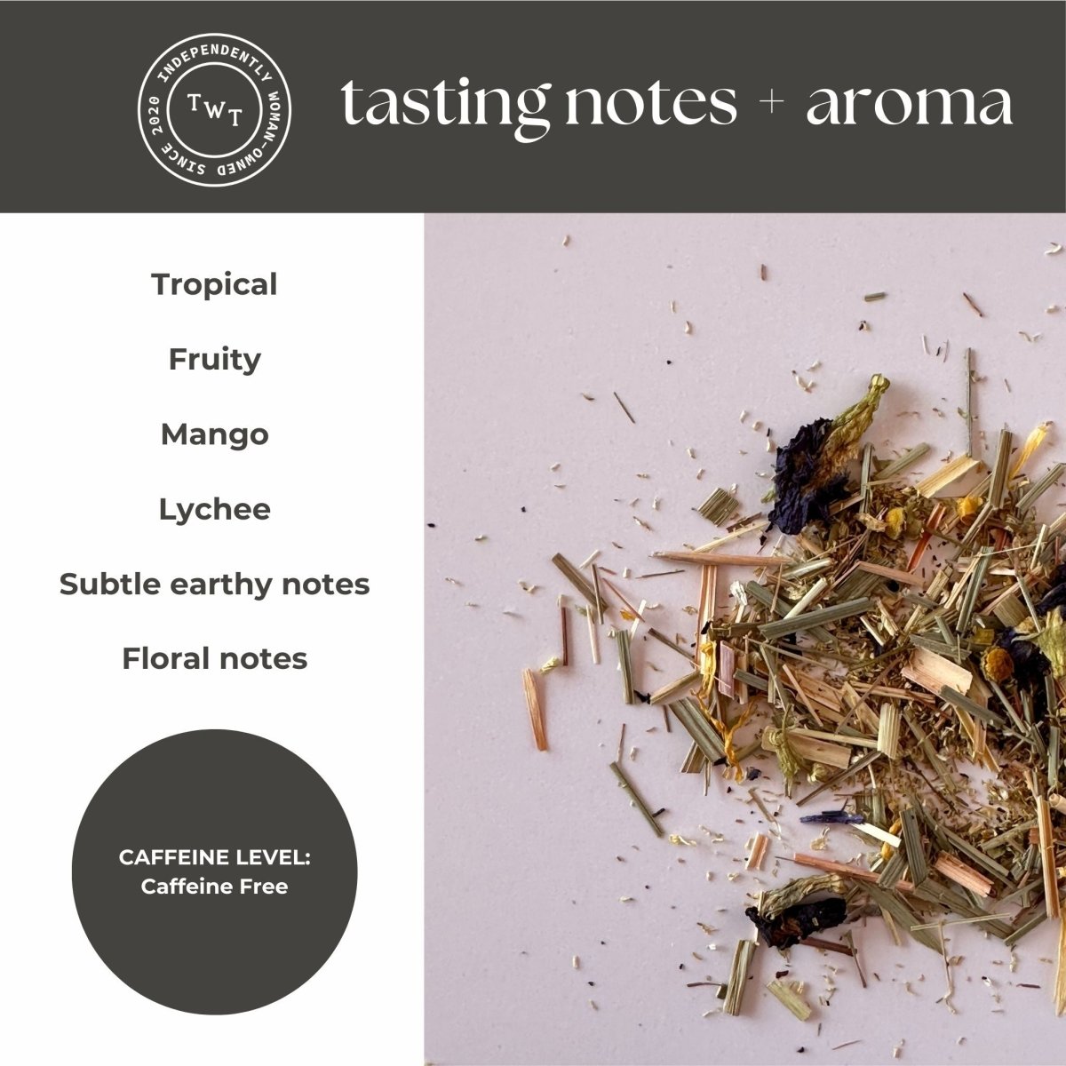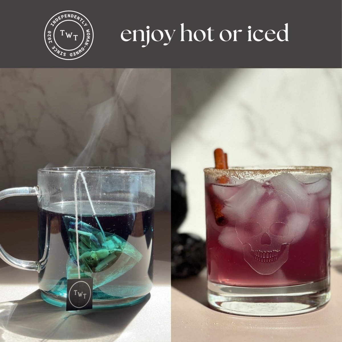 From the haunted gardens of the underworld, this caffeine-free botanitcla brews a bewitching blue hue perfect for moonlit sips, iced or hot. Add lemon to summon the spirits! Ingredients include butterfly pea flower, lemongrass, mango, and lychee flavors. Brews blue, but then add citrus to turn it purple!
