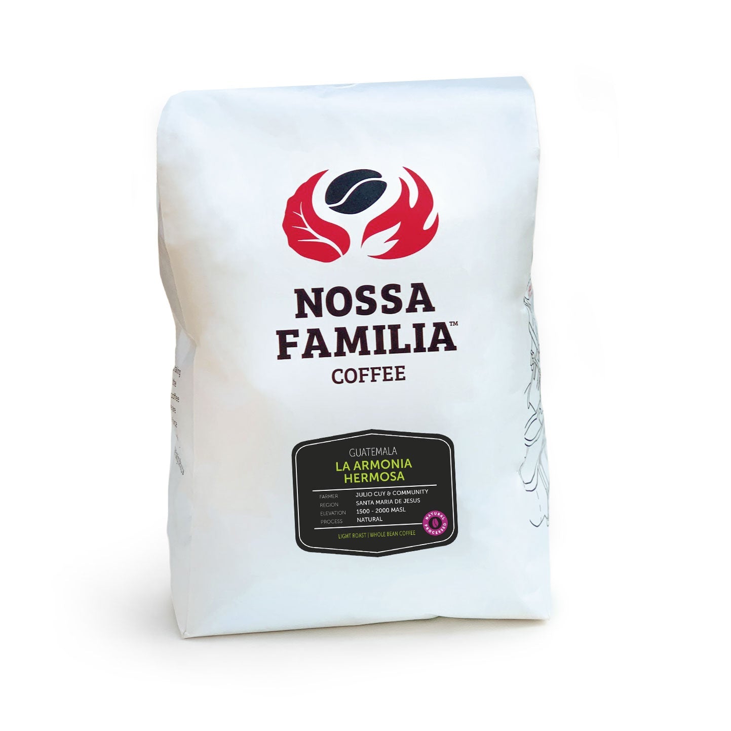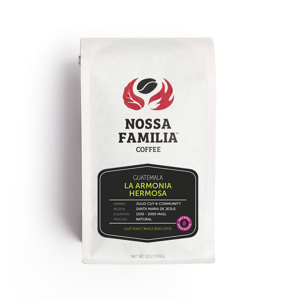 From the stunning Santa Maria de Jesus region of Guatemala, La Armonía Hermosa Natural, "The Beautiful Harmony" in English, is crafted from a blend of Bourbon, Caturra, Catuai, Pache, and Paca beans. This natural-processed coffee stands out for its bold, fruit-forward character, offering notes of dried cranberry, cacao nibs, and warming allspice. The natural process brings out a rich sweetness and layered complexity, while its full body and smooth finish make it a deeply satisfying cup. A perfect choice for those who appreciate vibrant and distinctive flavors.