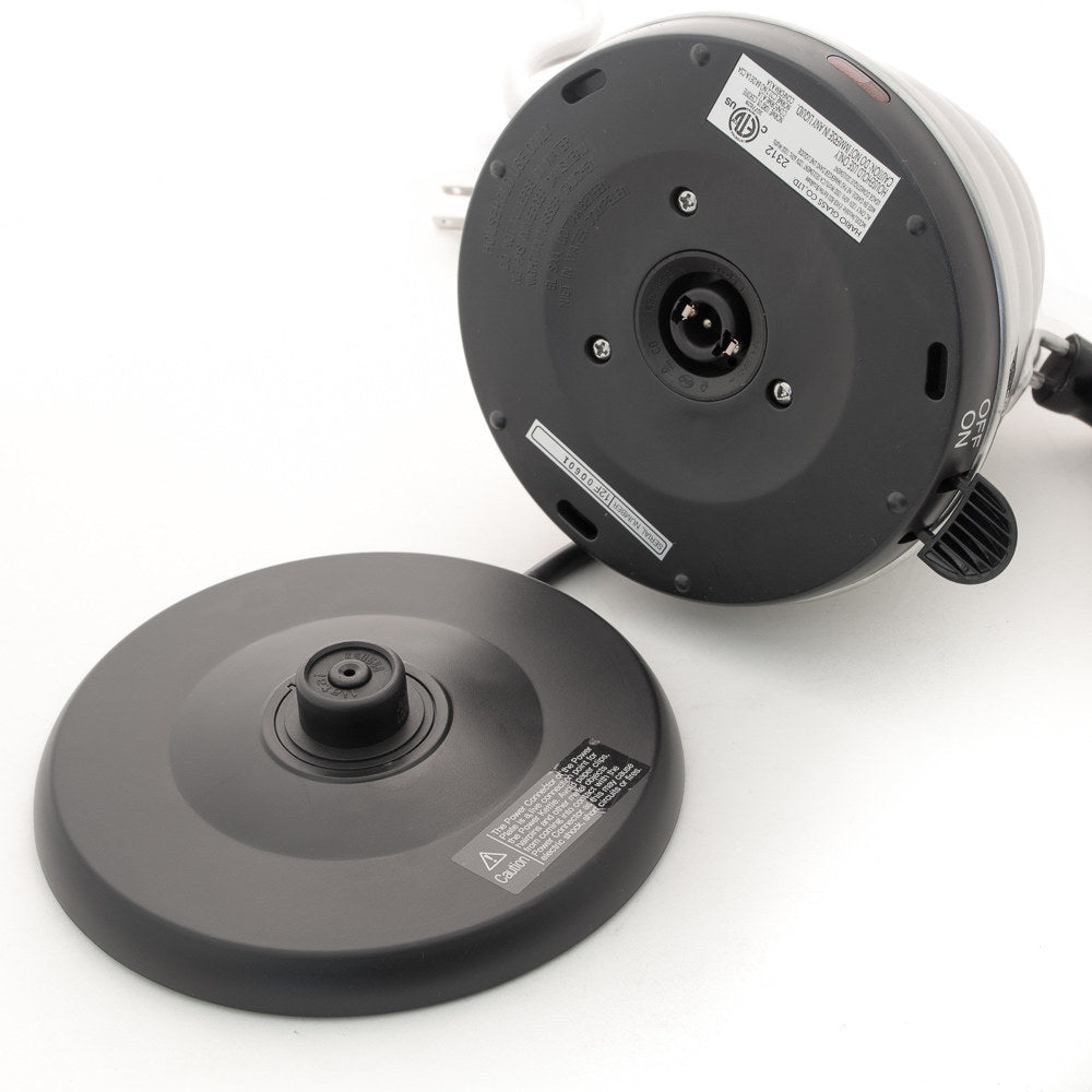 The Power Kettle’s spout was thoughtfully designed for pour-over coffee brewing with precise pouring and control of speed and coverage. The Hario Buono Power Kettle heats the water to boiling and then features an automatic shut-off. All you have to do is fill the kettle and turn it on. For serving purposes, the kettle is cordless and the base allows the kettle to rotate 360 degrees. For added flexibility and a streamlined look, an excess power cord can be stored inside the power plate.