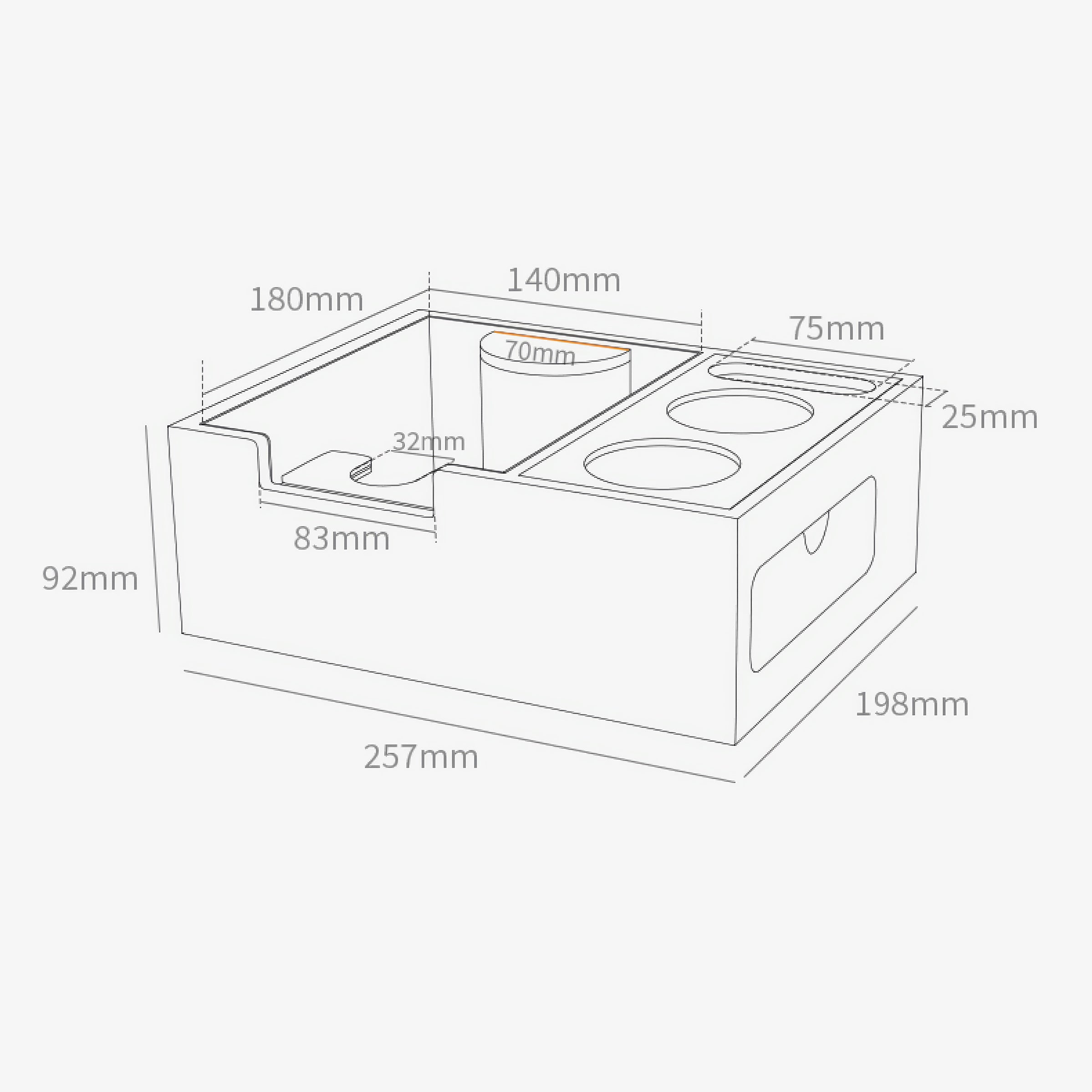 Streamline your espresso workflow with our All-in-One Tamping Station. Crafted from premium walnut wood, this comprehensive station features integrated tool storage, distribution area, tamping platform, knock box, and cleaning zones—keeping everything you need within reach.