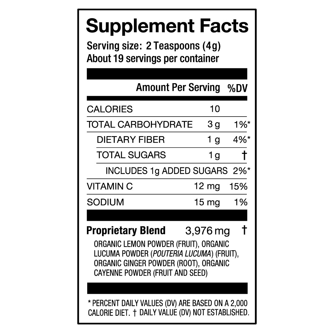This blend is made of 5 simple ingredients – Organic Lemon Powder, Organic Lucuma Powder, Organic Ginger, Organic Cayenne and Salt. That’s it! All you need to get your body moving first thing in the day. And now, the Morning Jumpstart formula is even better as we’ve amped up the ingredients to provide a Good Source of Vitamin C!