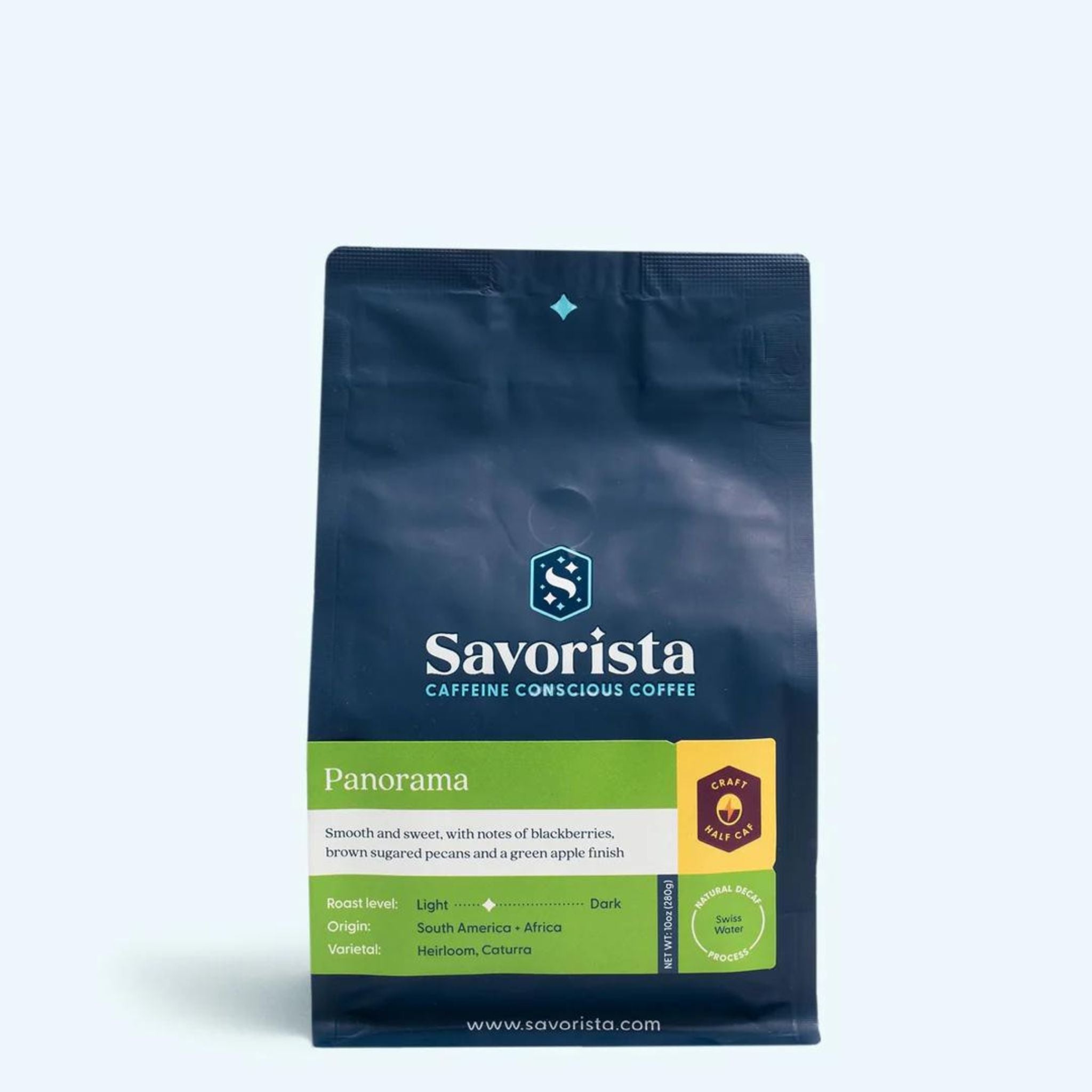 By choosing the "Panorama Half Caf", you're sailing past the corporate seas—ditching Amazon hauls and Starbucks like chains for the real deal from our curated US small-batch roasters and businesses like Savorista Coffee. Your support fuels their craft, keeps flavors fresh, and builds a bolder coffee world. Cheers to the independents! ☕