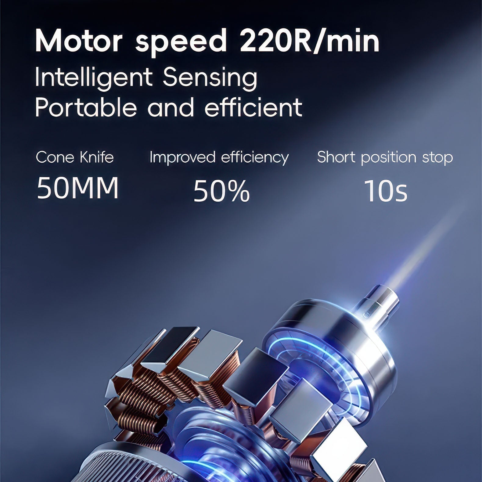 Intelligent Sensing Motor – 220 RPM: Smart-sensing motor boosts efficiency by 50% and auto-stops after 10 seconds to save battery life.