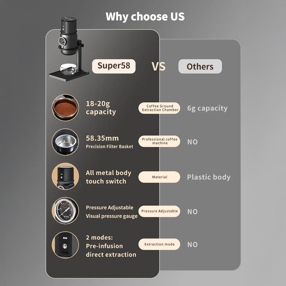 Experience café-quality espresso anywhere with the STARSEEKER Super 58. Its 58.35mm precision basket, pressure gauge, and dual brewing modes deliver rich, authentic espresso with thick crema in a durable all-metal portable design.