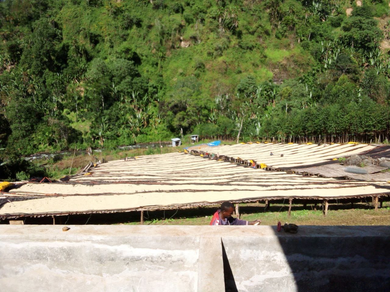 The producers use intercropping techniques, planting false banana trees, maize, Korch, Wanza, and Sesa to provide shade for the coffee plants. Shade selection depends on the age and specific needs of the coffee trees. The area’s soil is a rich sandy loam with excellent water retention and drainage. With proper planting practices, it is self-sustaining and does not require fertilizer to produce high-quality coffee. More than 360 local producers supply cherries to the washing station.