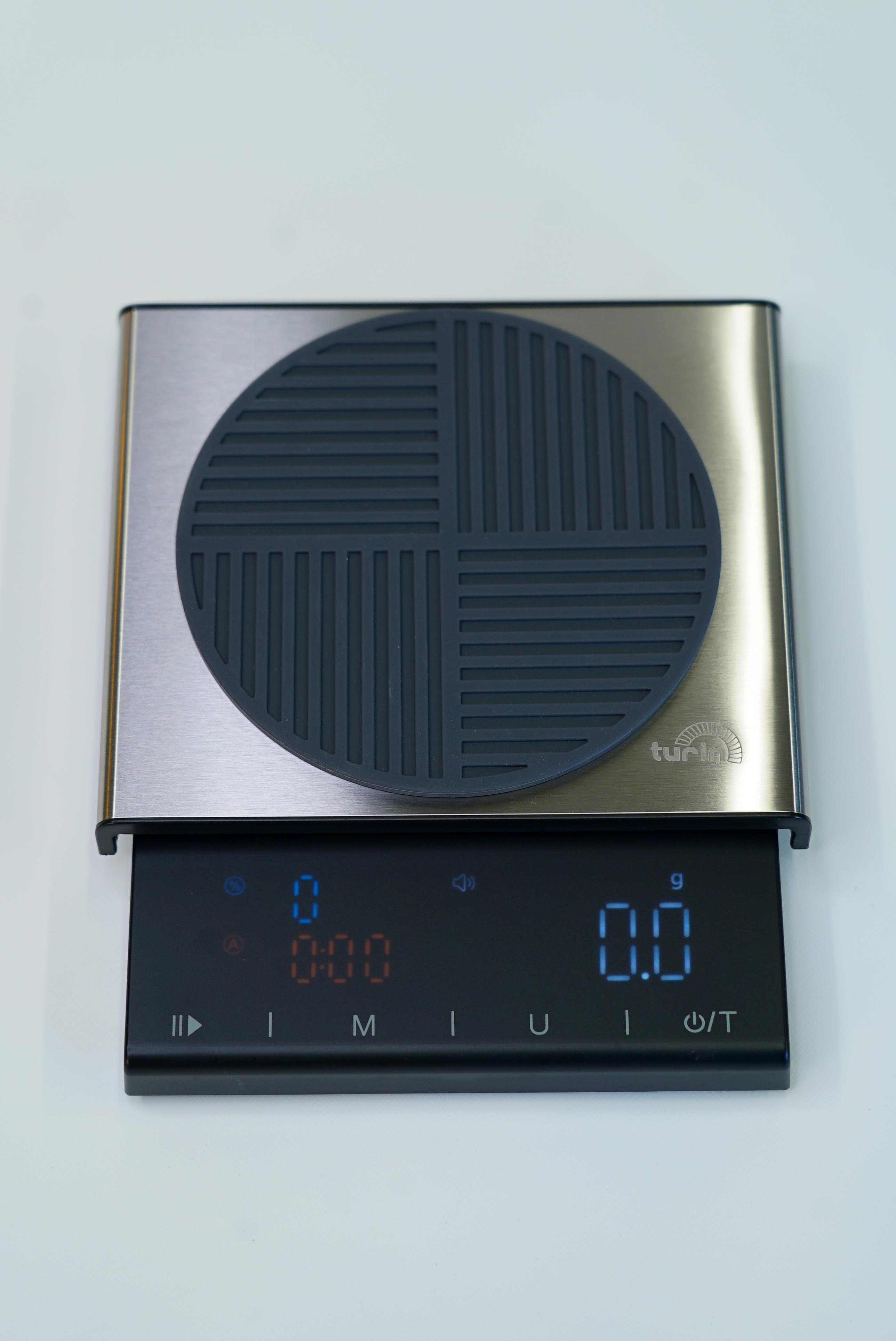 The Turin Pour Over Scale has a sleek design measuring 5.5 inch wide x 6.9 inch long x 1.25 inch tall (with silicone mat) and weighs a mere 13.5oz (382g).