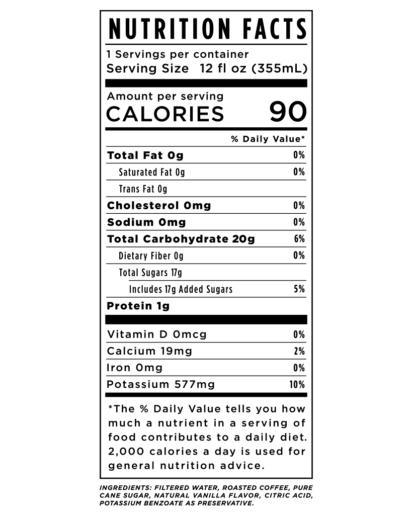 CONTENTS: 100% roasted Arabica coffee, filtered water, and vanilla flavoring.